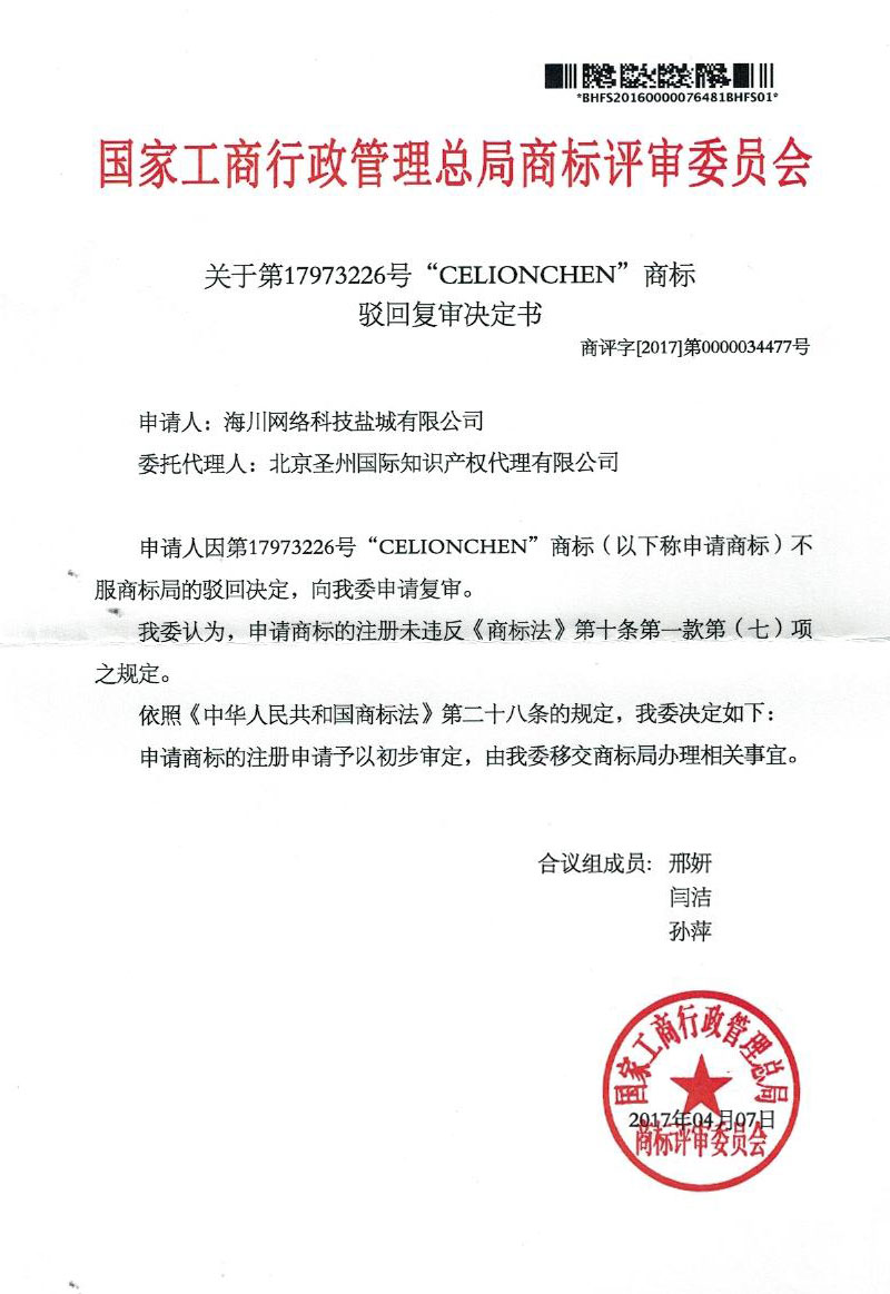 北京圣州国际代理海川网络科技盐城有限公司第17973226“CELIONCHEN”商标驳回复审成功案