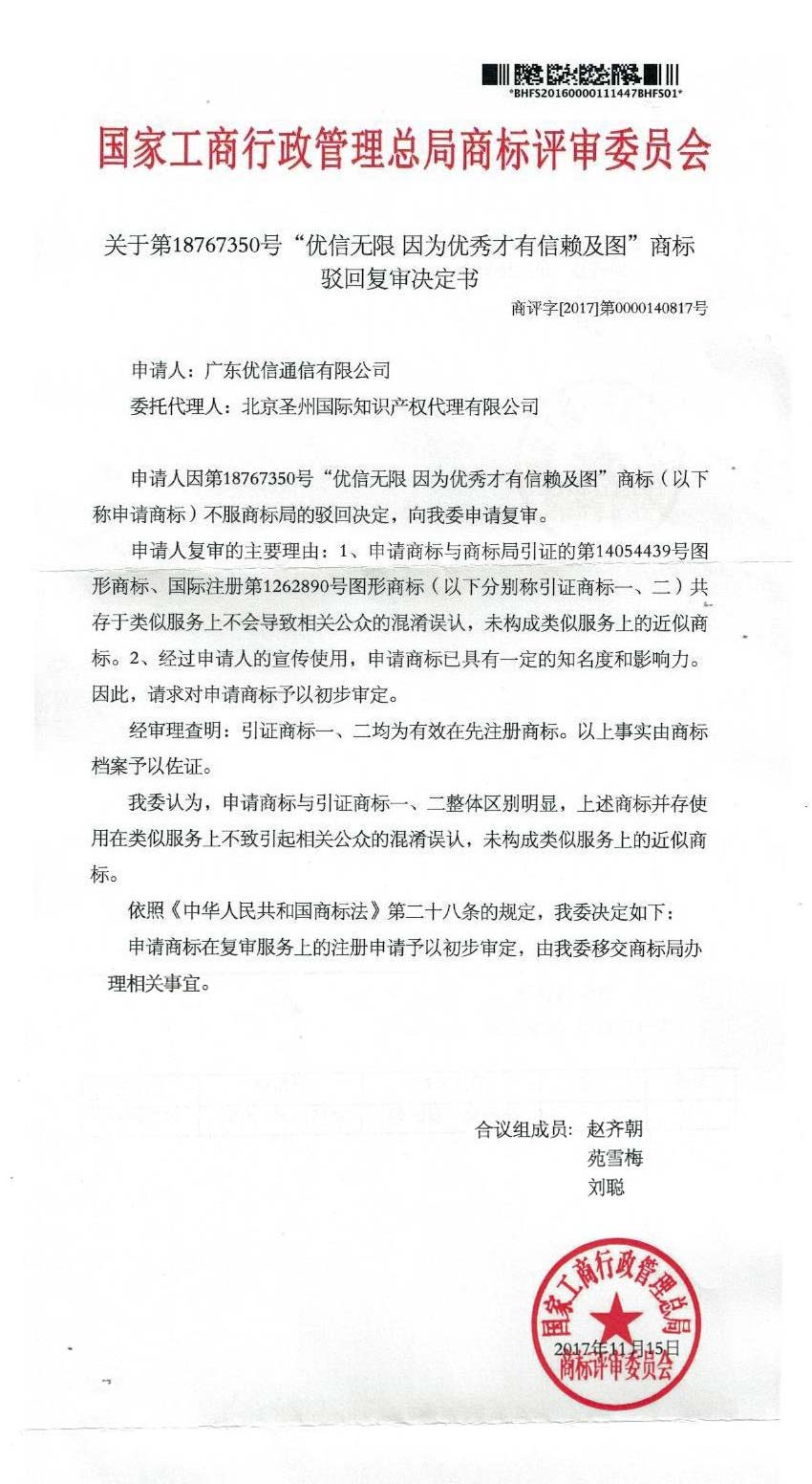 北京圣州国际代理广东优信通信有限公司第18767350号“优信无限及图”商标驳回复审成功案