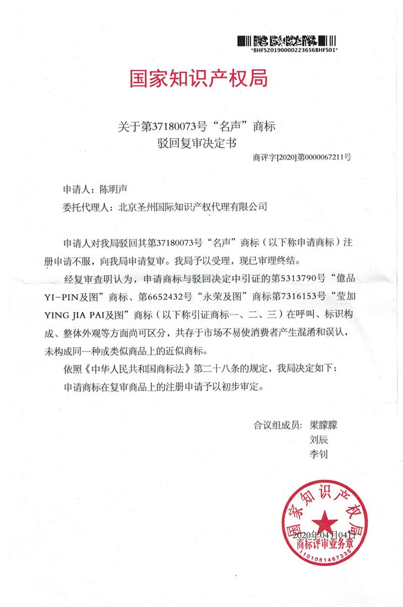 北京圣州国际代理个人第37180073号“名声”商标驳回复审成功案