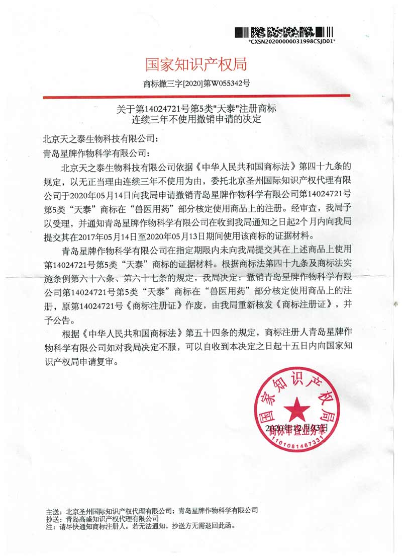 北京圣州国际代理北京天之泰生物科技有限公司第14024721号第5类“天泰”商标连续三年不使用撤销成功案